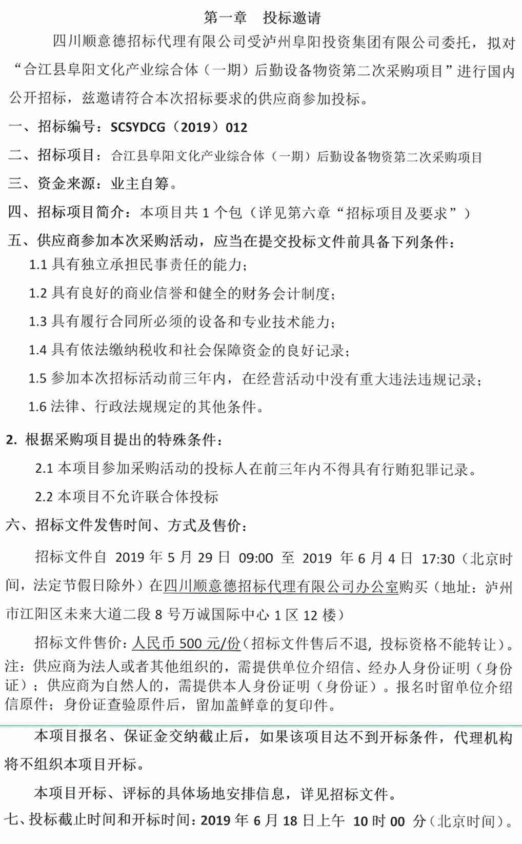 合江縣阜陽文化產(chǎn)業(yè)綜合體(一期)后勤設備物資第二次采購項目