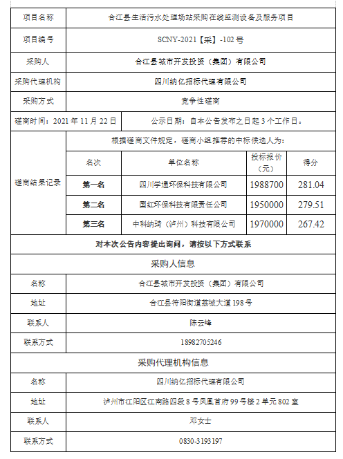 合江縣生活污水處理場站采購在線監(jiān)測設(shè)備及服務(wù)項目競爭性磋商結(jié)果公告