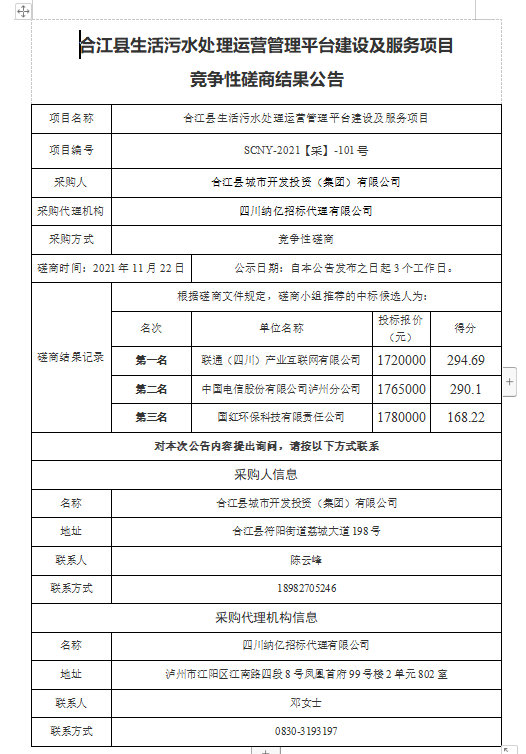 合江縣生活污水處理運營管理平臺建設及服務項目競爭性磋商結果公告