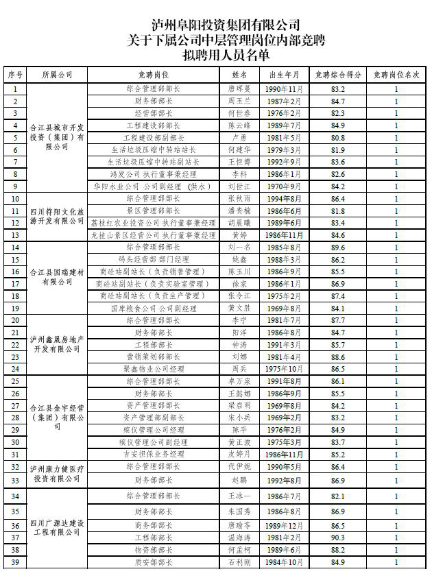 根據(jù)《瀘州阜陽投資集團(tuán)有限公司關(guān)于下屬公司中層管理崗位內(nèi)部競聘工作的公告》(瀘阜投發(fā)〔2020〕21號)的規(guī)定,經(jīng)阜陽集團(tuán)黨委會研究決定,擬聘用唐琿蔓等39人為瀘州阜陽投資集團(tuán)有限公司下屬公司中層管理人員?,F(xiàn)面向社會公示7日,公示時間2020年6月19日至2020年6月25日。公示期間,如有問題,請及時向瀘州阜陽投資集團(tuán)有限公司組織與人力資源管理部反映。要求舉報者署實名,實事求是地反映問題,并提供必要的調(diào)查線索。