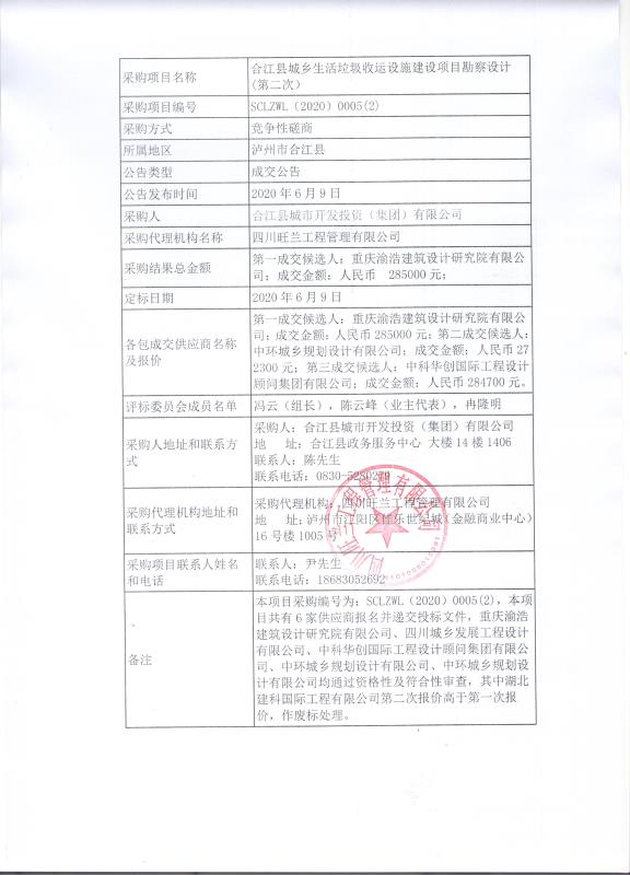合江縣城鄉(xiāng)生活垃圾收運(yùn)設(shè)施建設(shè)項(xiàng)目勘察設(shè)計(jì)招標(biāo)(第二次)成交公告