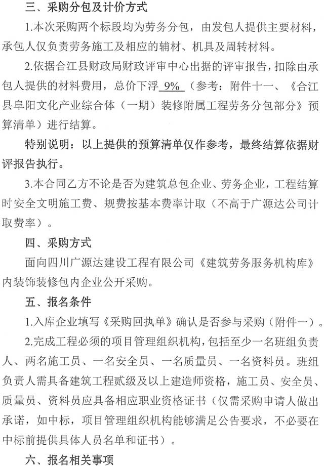 采購(gòu)公告:四川廣源達(dá)建設(shè)工程有限公司阜陽(yáng)文化產(chǎn)業(yè)綜合體(一期)裝修附屬工程勞務(wù)分包企業(yè)采購(gòu)公告(第二次)