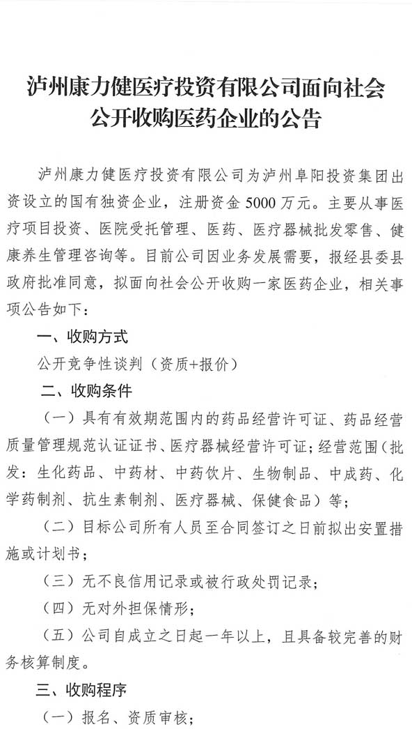 瀘州康力健醫(yī)療投資有限公司面向社會(huì)公開收購(gòu)醫(yī)藥企業(yè)的公告.doc