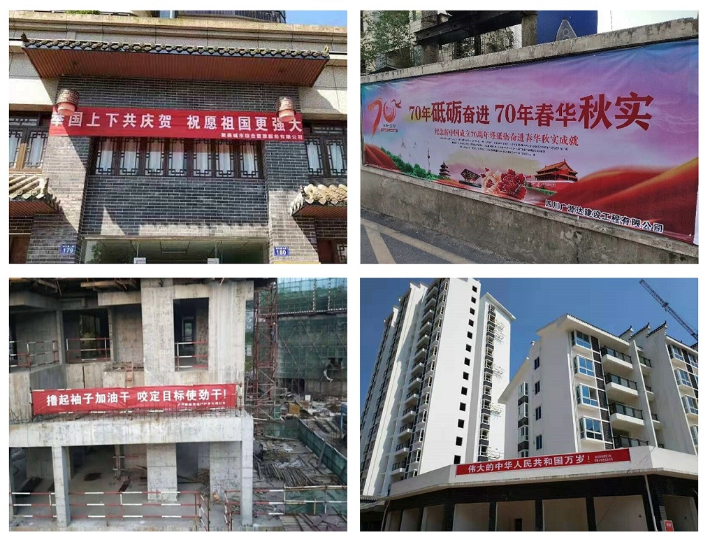 為慶祝新中國(guó)成立70周年,城投公司、廣源達(dá)公司、鑫晟公司于近日在公司項(xiàng)目部、售樓部等地懸掛慶祝標(biāo)語(yǔ),激發(fā)群眾愛(ài)國(guó)熱情,營(yíng)造良好國(guó)慶氛圍!